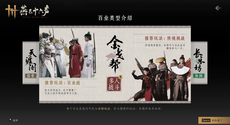 游戏还有一种叫做“百业”的玩法,类似于其他游戏的帮派,分为金戈帮、天涯阁和长乐坊三种。金戈帮可以多打一次周本,天涯阁可以提升百业奖励获取进度,长乐坊的商友可以互相看到各自的货物价格,方便通商。
