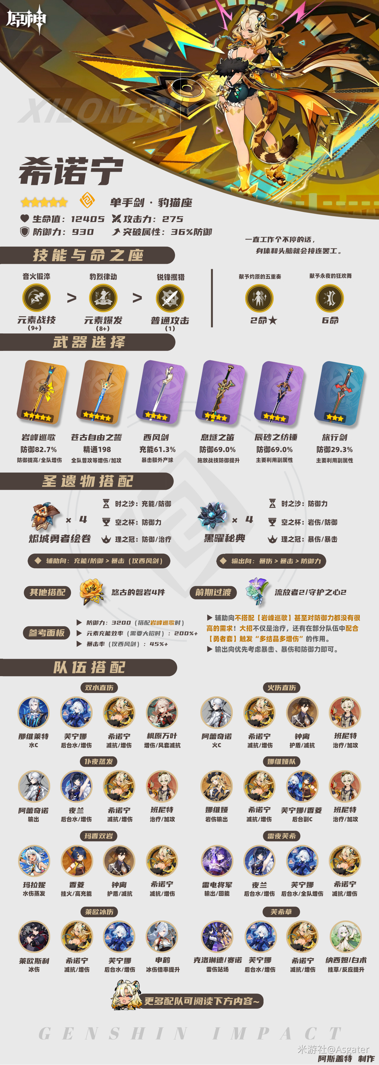 希诺宁是「五星岩系泛用辅奶C」,可以提供多元素减抗的辅助,根据队伍构成,也可以进行站场输出。
