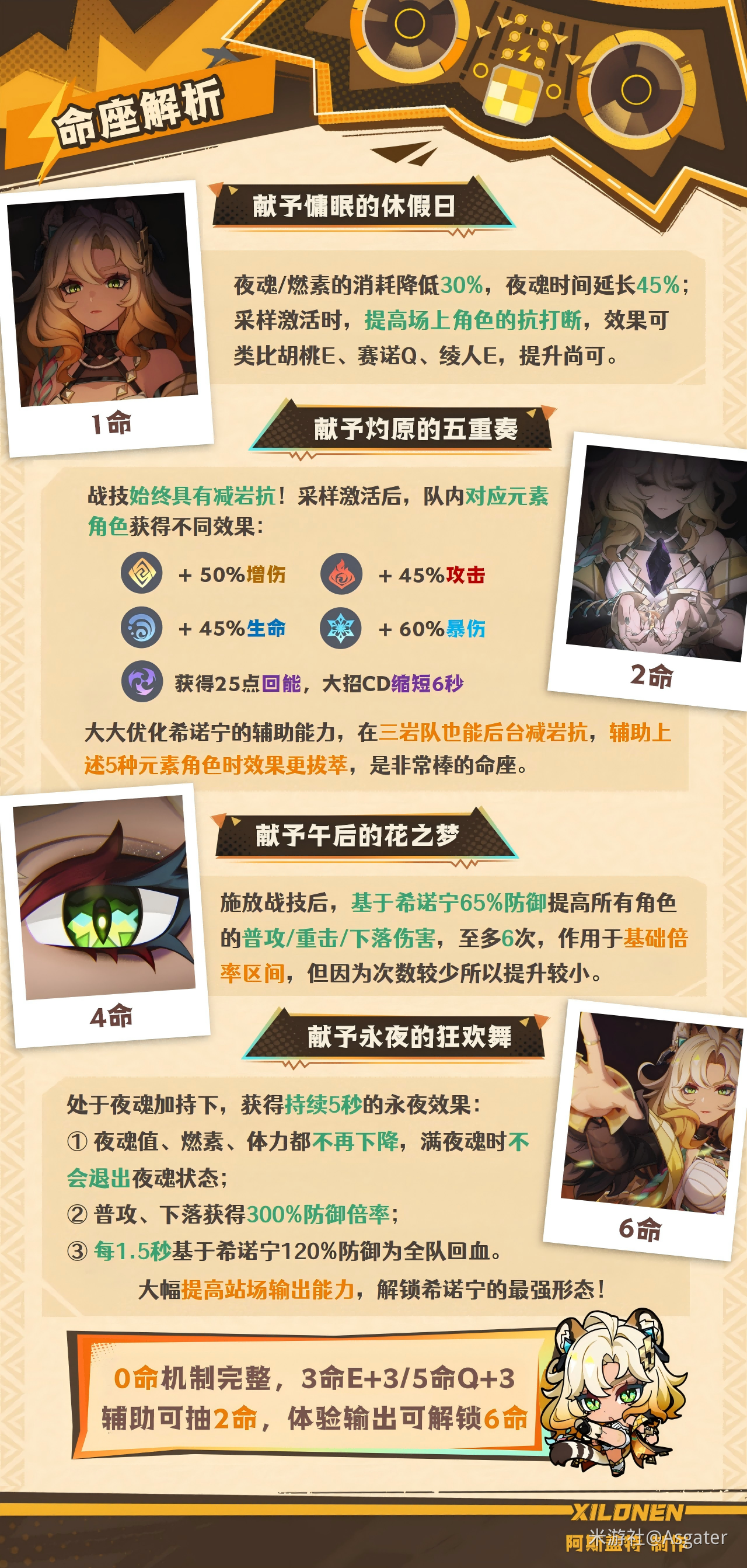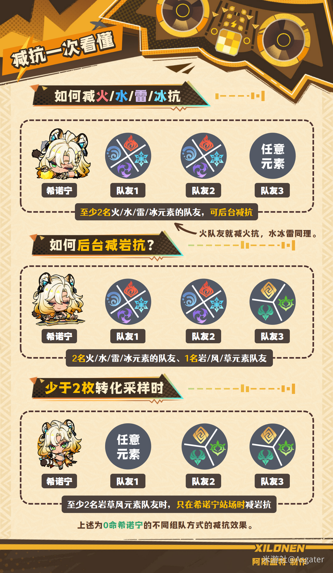 ② 该命座可让岩采样始终保持激活状态——这一效果的前提是队内有至少1名岩元素队友(不含希诺宁)。这一效果是希诺宁在三岩队也能后台减岩抗的关键。