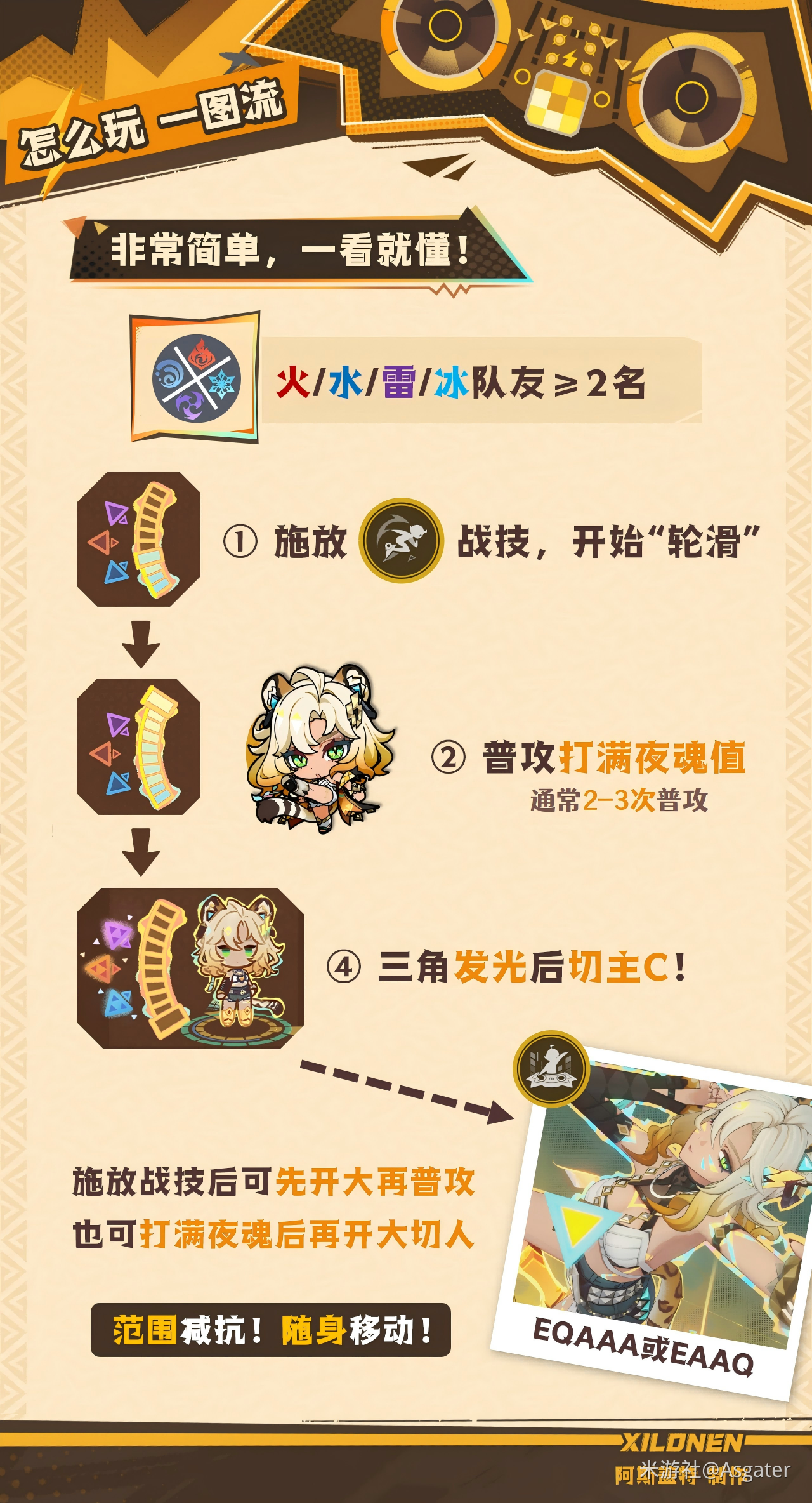 ④ 希诺宁EAAQ(或EQAAA)(E触发火结晶提供火增伤、后续普攻触发夜兰协同挂水再产生水结晶提供水增伤)
