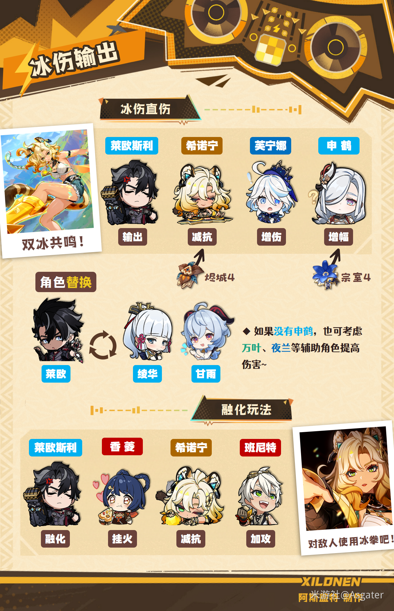 ② 2命希诺宁为火元素角色提供45%攻击力,可考虑换下班尼特——虽加成稍逊班尼特,但节省格子、走位更灵活/不再“画地为牢”也是替换的优点!