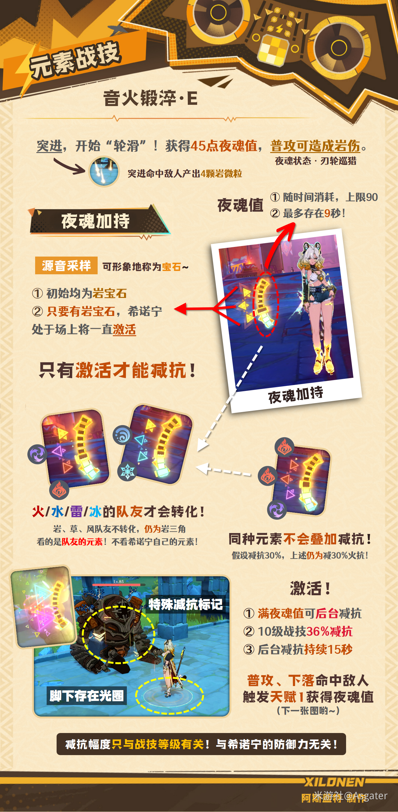 希诺宁施放元素战技,进入夜魂加持状态,能根据队伍中角色的元素类型,降低附近敌人的对应元素抗性;或在降低附近敌人的岩元素抗性的同时,提升希诺宁普通攻击与下落攻击造成的伤害。