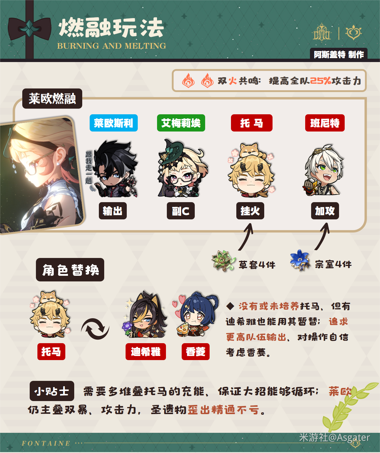 ◆ “调香师”和托马触发燃烧反应,持续补充火元素,莱欧斯利可以稳定触发融化,提高输出上限。