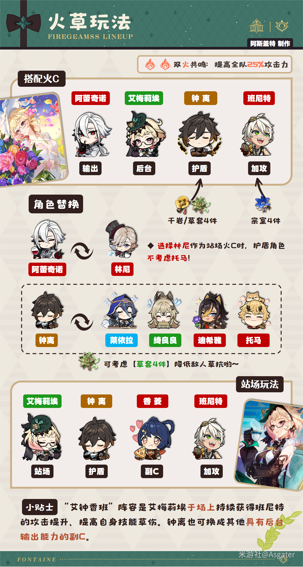③ 香菱也可以换成其他前台站场火C,这时“调香师”就退居后台,当副C。