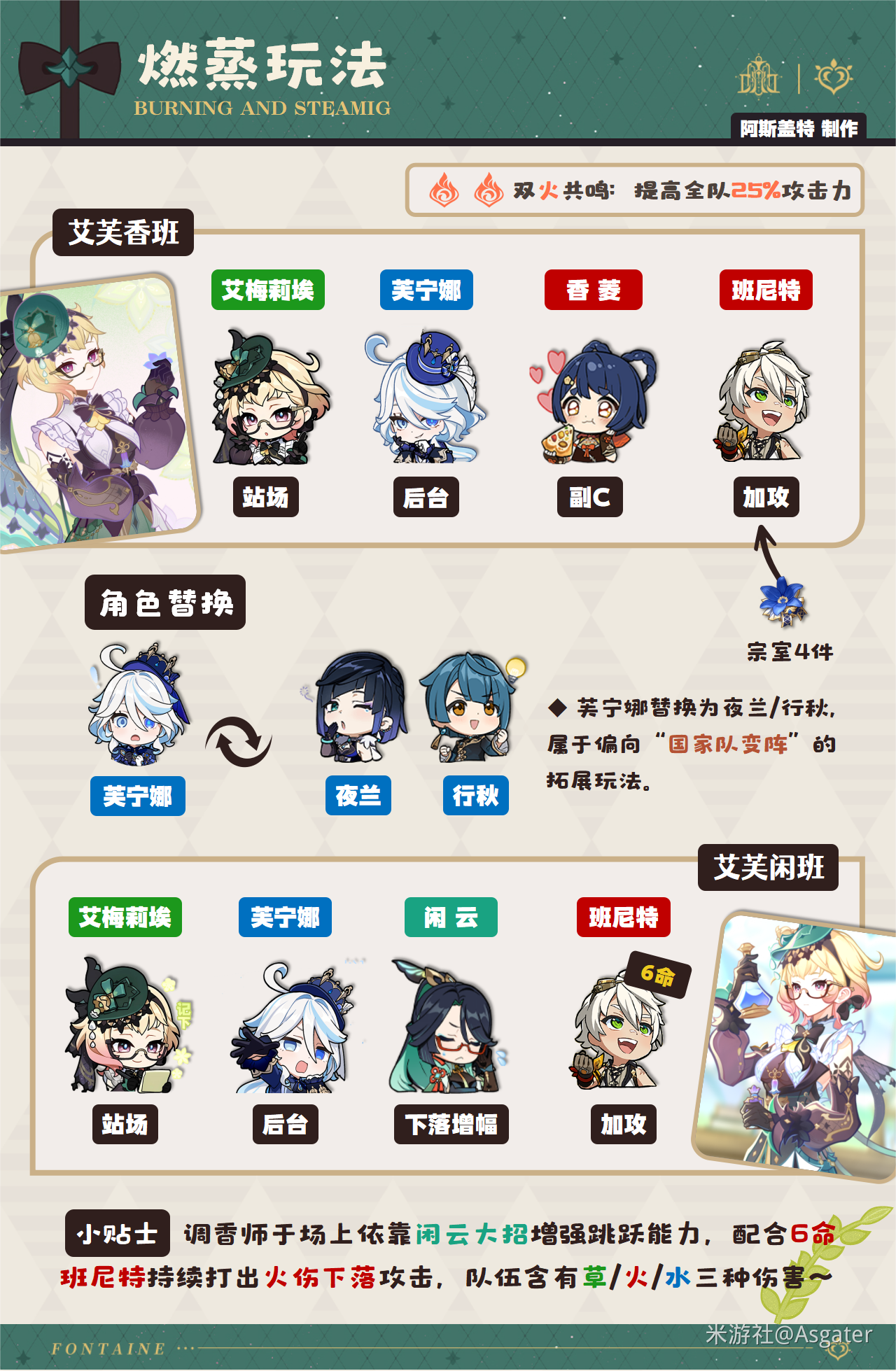 ① 艾妮芙白:妮露4E、芙宁娜EQ、“调香师”EQ、白术EQ后普攻补草