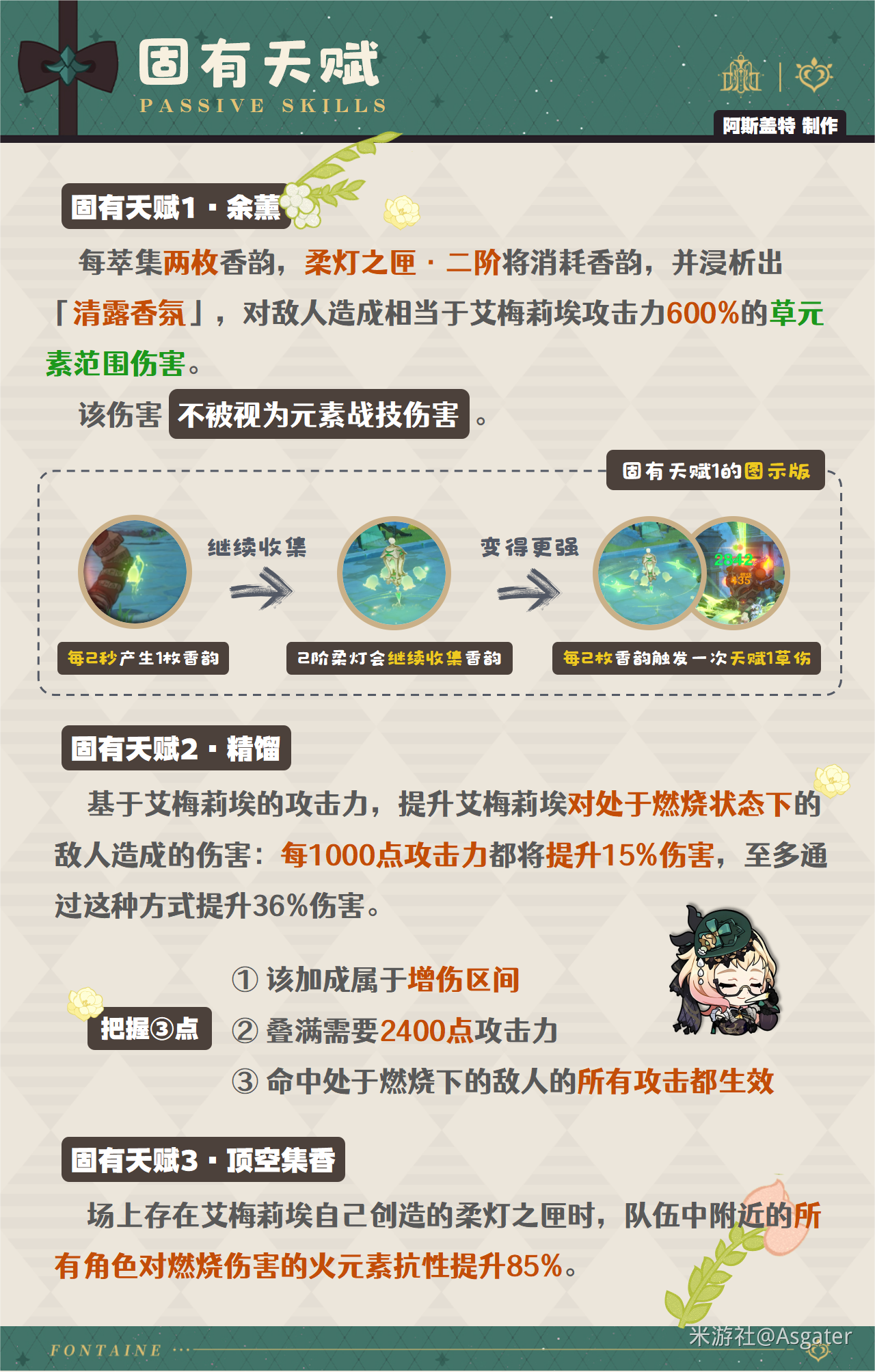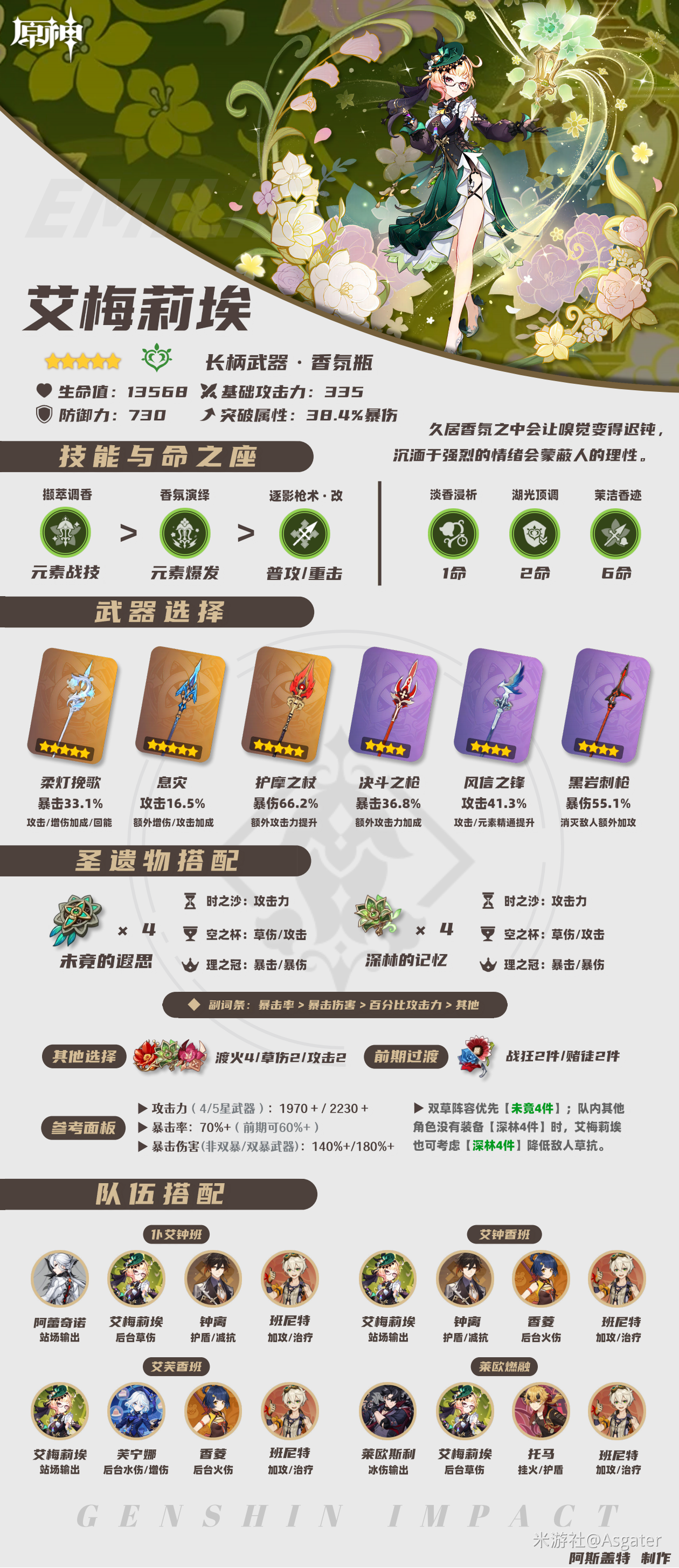 ② 艾梅莉埃的技能倍率很高,但燃烧伤害这玩意儿,她自己又没啥加成手段,所以还是以草元素伤害为主。