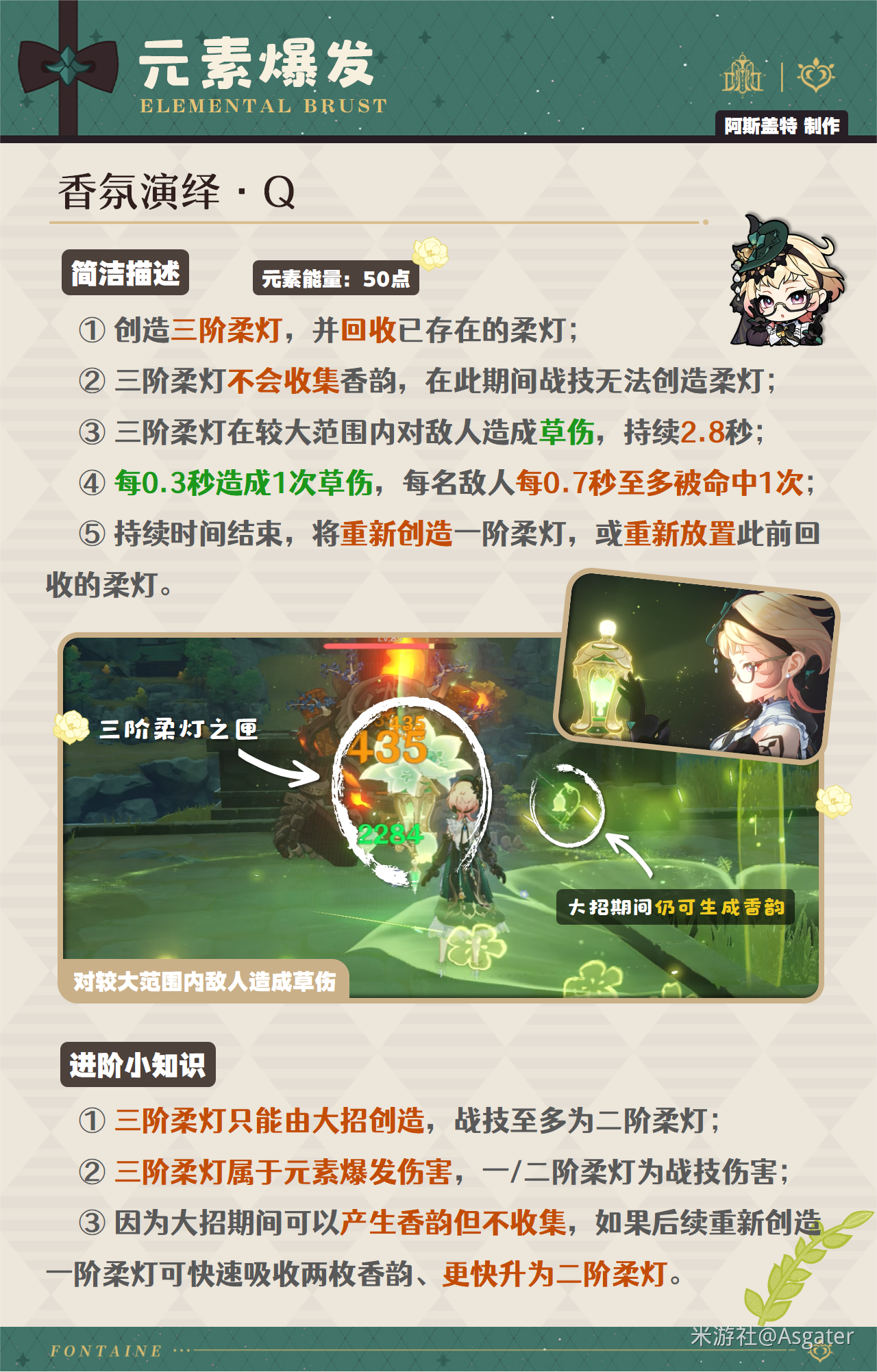 ② 推荐在柔灯升到二阶后再释放大招,这样二阶柔灯可以打出更多次天赋1的草元素伤害。