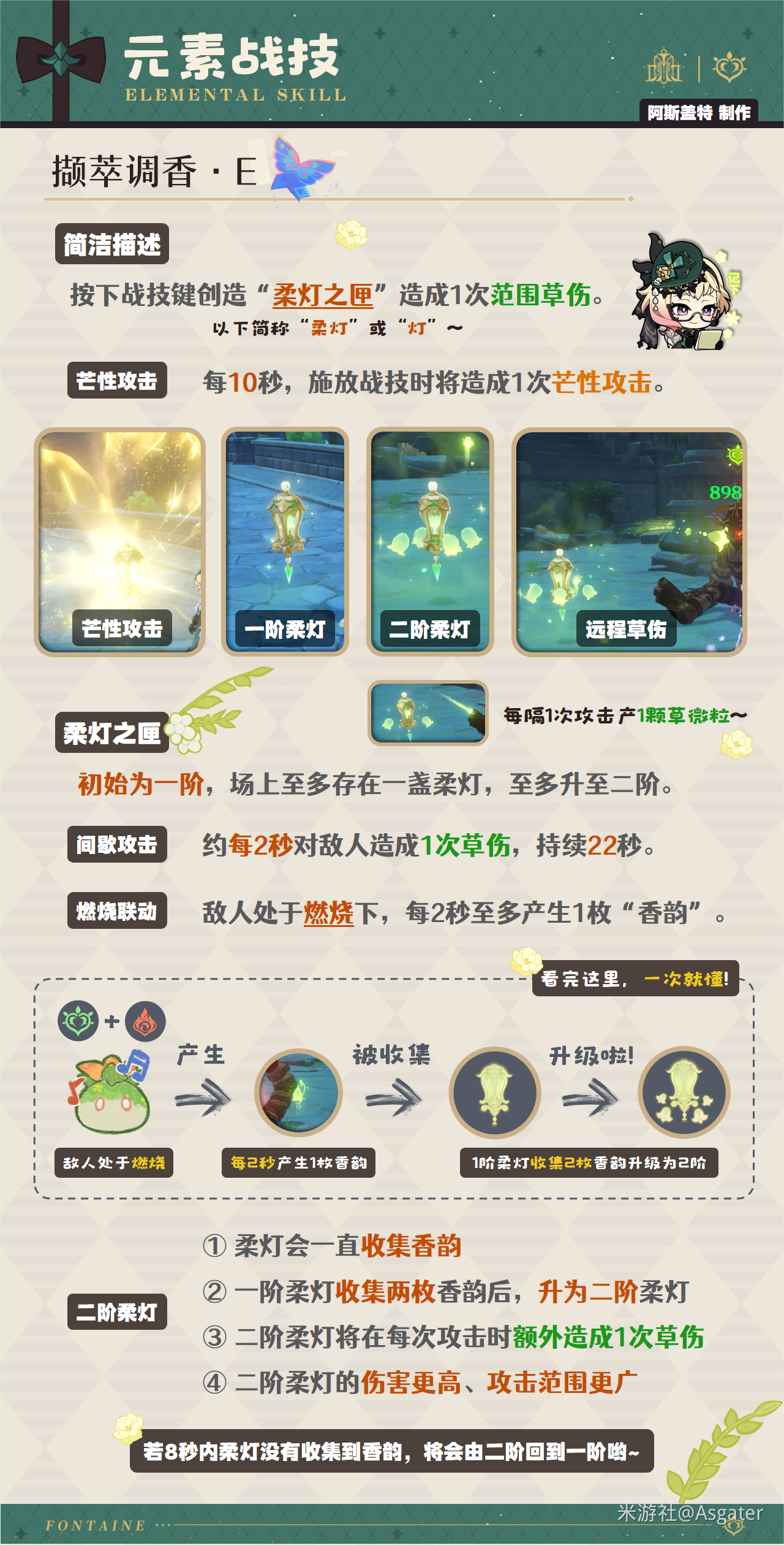 ③ 收集2枚香韵,柔灯会升到2阶,之后每收集2枚香韵还会造成1次额外的草元素伤害(需要解锁天赋1)。
