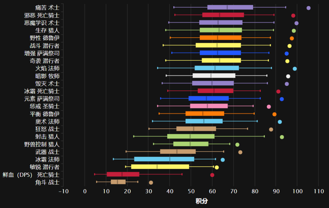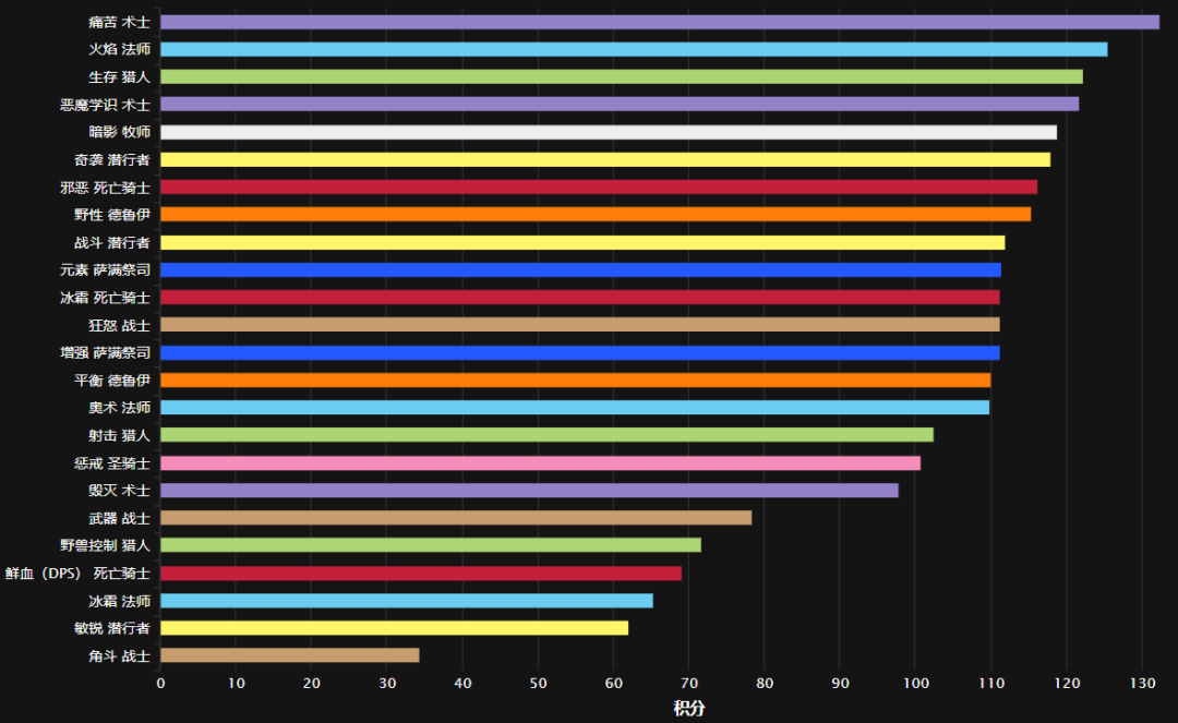 至于16-20名,依然是奥术法师、狂怒战士、射击猎人、野兽控制猎人和武器战士的老面孔,排名基本没有变化。而垫底的则是冰霜法师、敏锐贼和鲜血死亡骑士,这些天赋目前的可玩性确实不高,勇士们慎重选择啊!