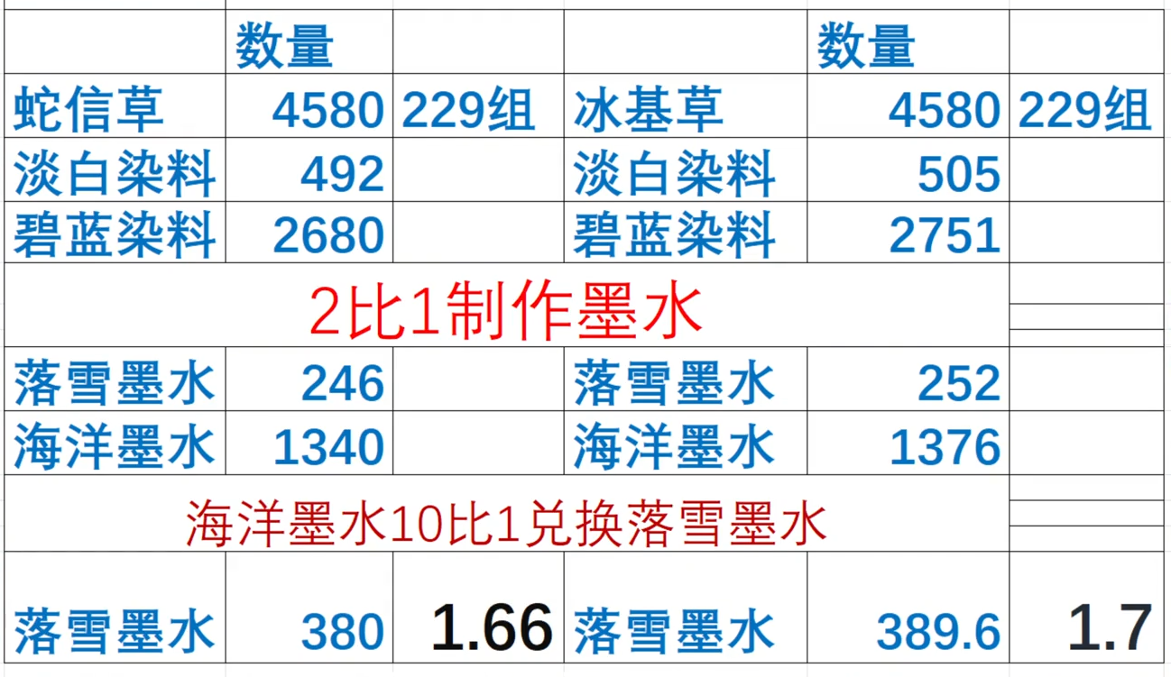 蛇信草和冰棘草这对好基友,可以磨成落雪墨水。平均来说,一组蛇信草能榨出1.66个落雪墨水,冰棘草稍微给力点,能榨出1.7个。为了方便计算,咱们就取个平均值,算1.68个/组。