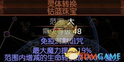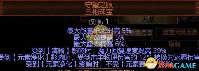 既然发出珠宝了就顺便提一下,珠宝选择清晰回蓝+元素系列净化光环转伤的。转伤有多牛自行体会,不宜多说。简单来讲三相转伤搭配塑界或裂界衣服上的转伤配合恨意药水的转伤再外带个欧克的最低绝对抗性减伤(欧克减伤需要自行调节抗性,如果你三相是转冰,衣服也是转冰,那就把你的冰霜的绝对抗性变成3抗里最低的),这样搭配下来到底有多硬?话题转回上面提到的项链配合三相来说,此珠宝转伤光环位元素净化,那么你就需要一条元素净化免保留的奥尔之兴,如果是冰霜火焰净化就去找对应的项链。这里要提一下,不要
