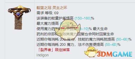 地心BOSS掉落,光环免魔为随机词条。项链需要搭配三相来使用。为何要用这条项链?前面已经提到此BD的伤害来源完全来自与蓝量的多少和回蓝的速度。如果带其他项链无论你身上再怎么堆蓝到最后可使用的蓝量都无法和一条光环免蓝所提供的蓝量相比,完全不是一个级别。为何要堆蓝?这里需要重点讲下。尿布头的耗蓝词缀是叠加的,所以问题就来了,当你蓝量不足以支持你的高耗蓝时伤害提升就遇到瓶颈了,回到头部耗蓝和增伤词条笼统的来说就是你有3000可使用蓝量所堆叠出来的耗蓝最后转化为伤害和你有6000可使用蓝量所堆叠出来的耗蓝转化的伤害是天差地别的。,这里说的就是伤害上限问题。