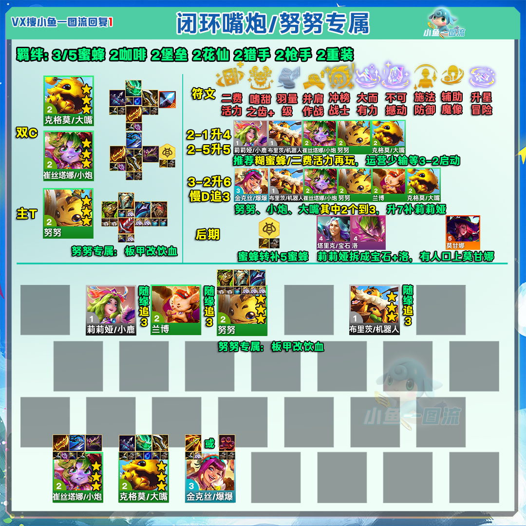 留牌策略: 蜜蜂+花仙,小炮没来?用2星老鼠/诺姆希顶着,或者上个2星萨勒芬妮,和莉莉娅凑个2花仙,给小炮打工!