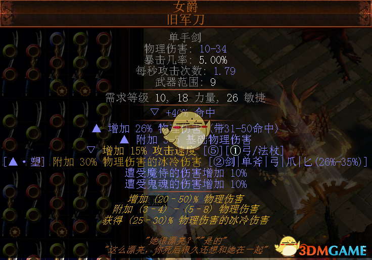 每种武器只有两种额外附加单元素伤害请注意挑选底子,匕首要求敏捷和智力、单手剑要求敏捷和力量、细剑要求高敏捷、斧头要求高力量。