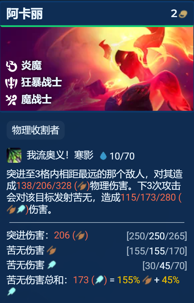 别忘了,阿卡丽还是个魔战士!3魔战士羁绊加持,每次普攻都有30%的几率“duang duang duang”地打出2次额外攻击。三星阿卡丽,一刀下去,半血坦克都得抖三抖!