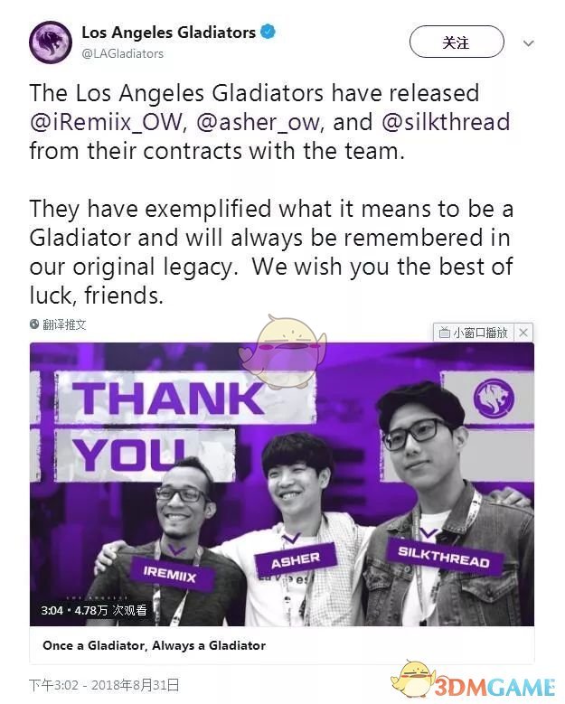 2018年8月31日,洛杉矶角斗士队官方推特宣布与主T选手Luis “iRemiix”Figueroa、输出选手Choi“Asher”Joon-seong、自由人选手Ted Z“silkthread”Wang解约。