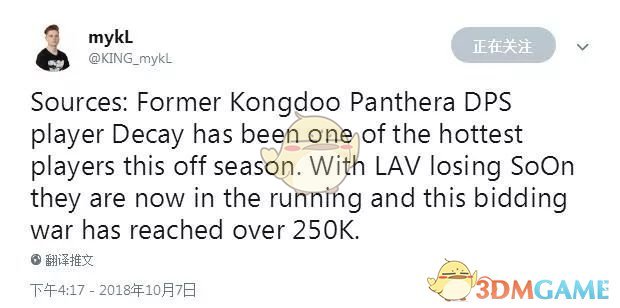 对于英勇队,此前有爆料称原队内核心输出选手SoOn已经加入了新组建的巴黎队,因此他们急需一名强力的输出选手来填补SoOn离开留下的空白。据悉,此次三方围绕Decay进行的争夺战已经进入了白热化阶段,目前给Decay开出的年薪也已经上升到了25万美元。