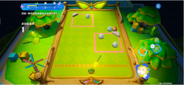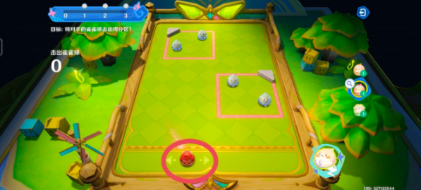 把橙色雀雀球移动到框内蓝色雀雀球的正下方,等指针转到正中间的时候,开始蓄力,建议蓄力3/4,让橙色雀雀球给蓝色雀雀球一个“爱的飞踢”,把它踢出框外!