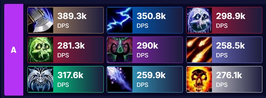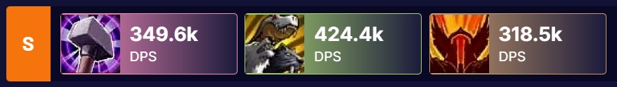 A级别的伤害输出职业有武器战、电萨、冰DK、邪DK、浩劫DH、毁灭术、踏风、冰法和暗牧。其中武器战出场率4.9%,电萨出场率6.2%,冰DK出场率6.2%,邪DK和DH出场率4.2%左右、毁灭术出场率4.1%。