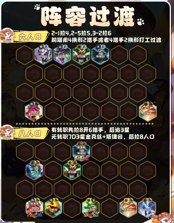 阵容过渡: 前期尽量用换形+猎手羁绊打工过渡,有猎手转职就优先开4猎手,没有猎手转职就开4换形。