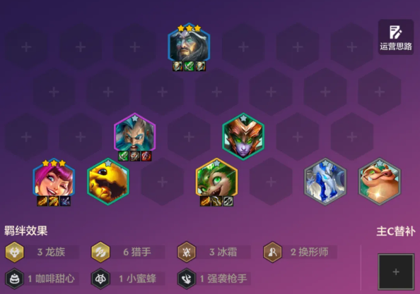 羁绊效果:3龙族+6猎手+3冰霜+2换形战士(T0级别,谁用谁知道!)
