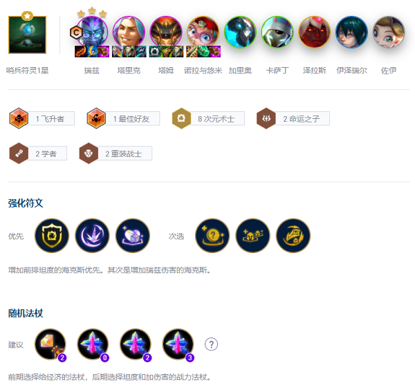 1. 成员名单: 瑞兹、塔里克、塔姆、诺拉与悠米、加里奥、卡萨丁、泽拉斯、伊泽瑞尔、佐伊。这套阵容,就是要玩转次元之力,让对手摸不着头脑!
