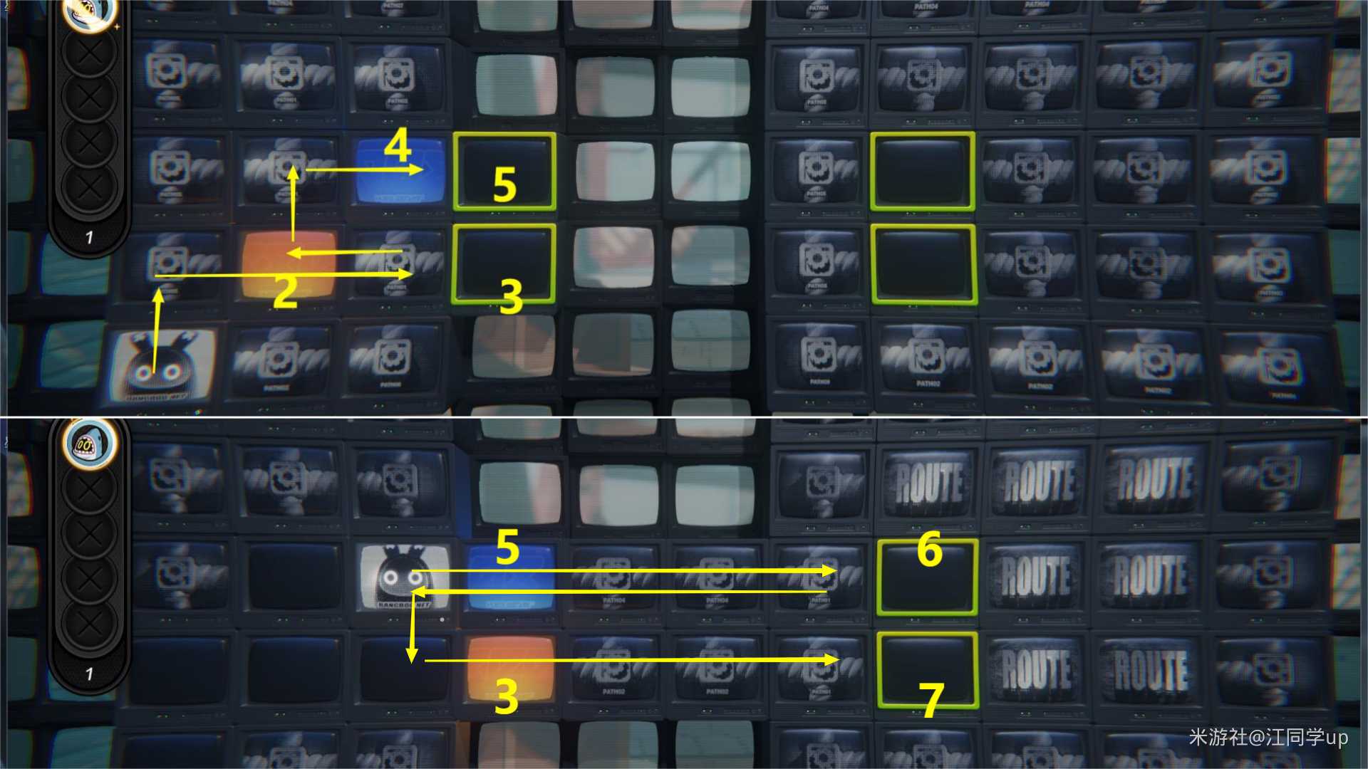(4) 重点来了!考验智商的时刻到了!先把2号橙色方块推到3区域,再把4号蓝色方块推到5区域。然后,把5号蓝色方块推到6区域,把3号橙色方块推到7区域。Duang~解谜成功!