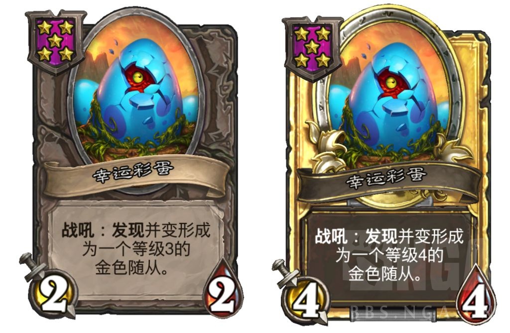 简单来说,这颗“幸运彩蛋”就像一个扭蛋机,只要你把它摆上战场,它就会给你一次“免费扭蛋”的机会,直接变身成一个3星的金色随从!想象一下,原本弱不禁风的小彩蛋,突然变成一个金光闪闪的强力打手,是不是瞬间感觉自己赚翻了?