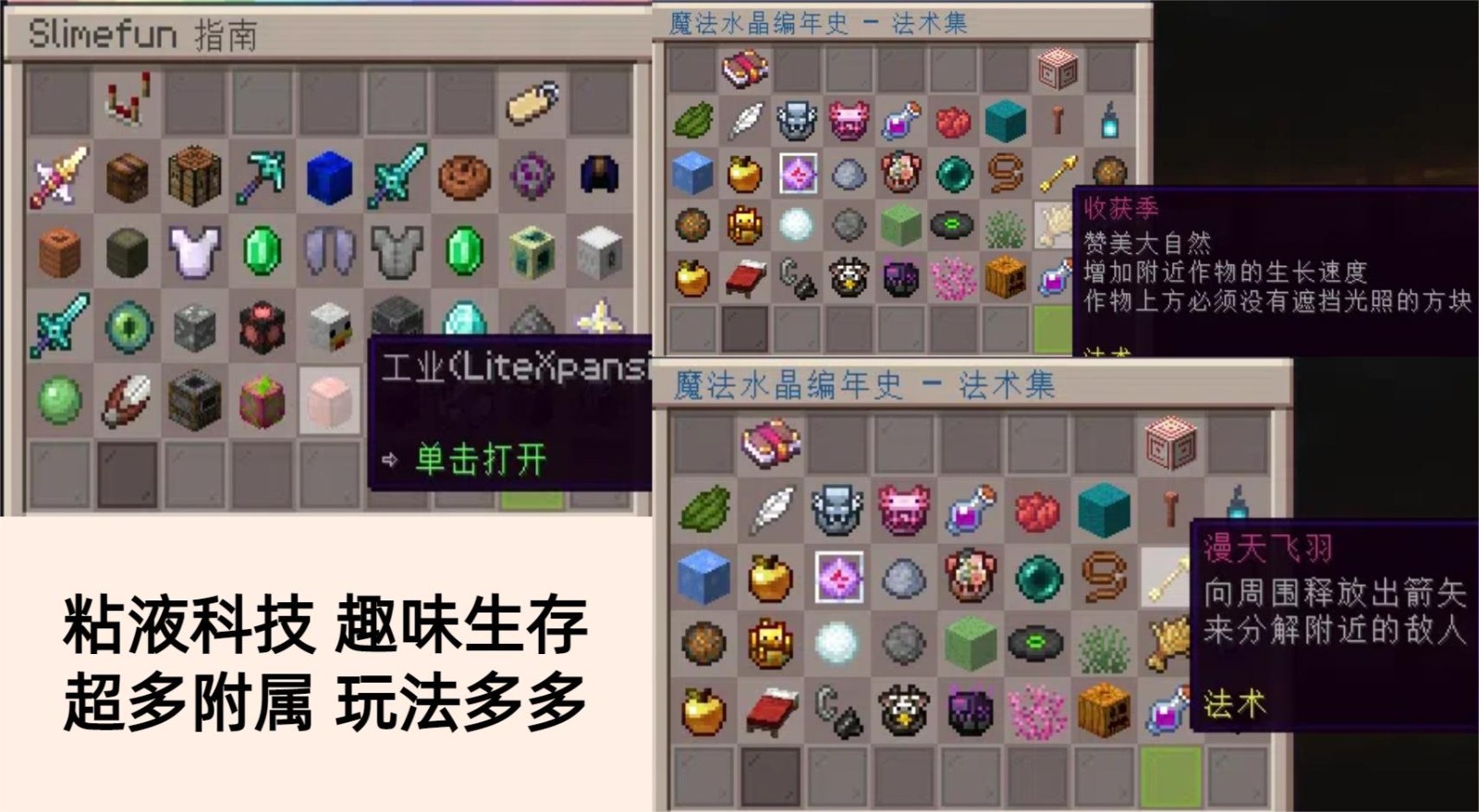 不喜欢玩RPG?没问题!我们的粘液科技绝对能满足你的科技梦!超多的附属模块,无论是工业科技、农业种田,还是魔法法术,应有尽有!让你沉迷其中,根本停不下来!
