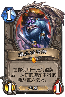这是一张掀起血雨腥风的卡牌,在加基森版本,这张卡还没有削弱,1费海盗拉帕奇斯成为玩家们最讨厌的开局,没有之一,海盗战,青海萨,奇迹贼这些存在在记忆中的卡组都会携带这张牌,还专门会为这张卡构筑海盗体系(海盗船长等);海盗帕奇斯因为有着冲锋效果(削弱前),并多一个攻击频率,且定向过滤牌库,使得帕奇斯一时之间风头无限,玩家们也调侃战士为此还了几个版本的债。