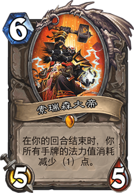 这是控制卡组和OTK卡组必不可少的构筑,所有手牌减费的效果实在太强大了,并且身材不是太亏,在6费的时候使用并不会亏太多节奏,而大帝的效果也相当于嘲讽,丢下去基本都是要解的;大帝的出现直接盘活了相当多的黑科技和OTK,一回合秒人的蓝龙萨,蓝龙贼,蓝龙冰等等,现在的狂野大帝依然是出场率前几的存在。