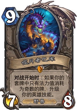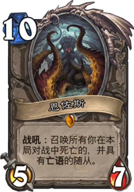 四大古神之一,是古神家族里面是最适用而且稳定的卡牌,相比于萨隆的随机和克苏恩的特定构筑,恩佐斯几乎适用于所有的亡语构筑,取得的效果往往是一锤定音的,也许只有恩佐斯才能于恩佐斯战斗吧。