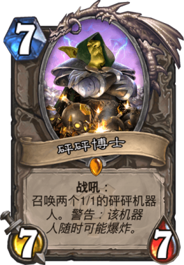 记得那时候砰砰博士的炸弹是绝佳的素材,狗贼嘘嘘也常被2个小炸弹炸得直接骂娘,砰砰博士的身材还是不错的,跟作战傀儡一样,但是价值一般都体现在战吼效果上,两个小炸弹炸得好可以直接完成返场,为了针对砰砰博士,那时候几乎是人手一个王牌猎人,以至于有人说:砰砰博士的战吼是召唤敌方的一个3费王牌猎人并消灭自己留下两个炸弹。