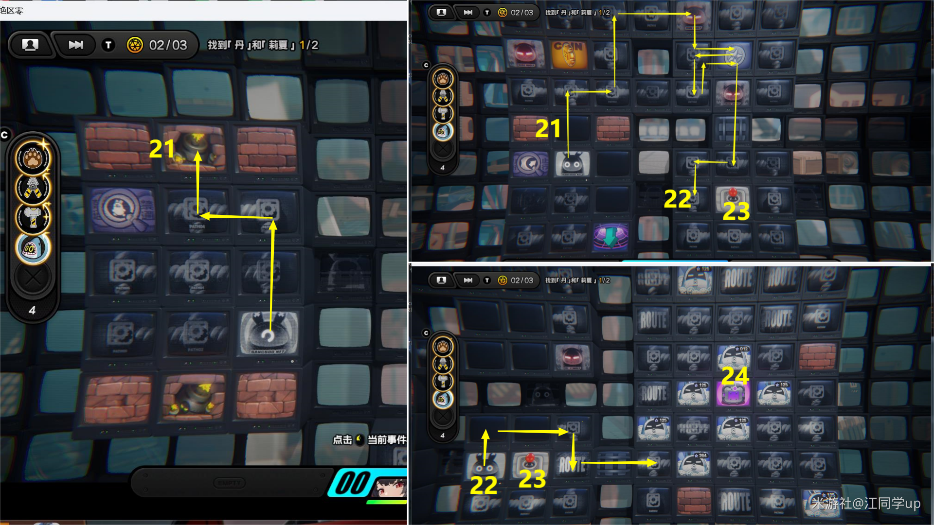 5. 区域21-24: 撞开21区,开启“躲猫猫”模式!一路风骚走位,躲避3只怪兽,冲向22区。在22区把23区的开关往右一撞,就能去右边的24区啦!记得顺手抓几只白色邦布,它们可是会掉银币的!