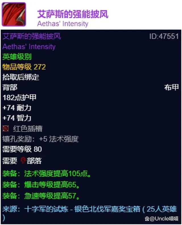 毫不夸张的说,这货的属性,简直能和冰冠堡垒的绿龙披风掰掰手腕!什么叫卧龙凤雏?什么叫棋逢对手?大概就是这个意思!毫不犹豫地说,90%的玩家拿到它,就可以直接宣布披风毕业了!自带红色插槽,再送你5点法强,简直是对你法术强度的终极压榨!各位法系职业,这可是必肝的神级披风啊!不肝不是艾泽拉斯好儿女!冲鸭!