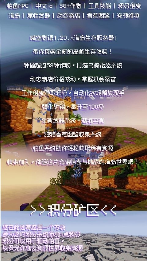还在等什么?赶紧加入“晴空物语1.20.x海岛生存服务器”,在这个充满惊喜、挑战和无限可能的世界里,书写属于你的传奇故事吧!