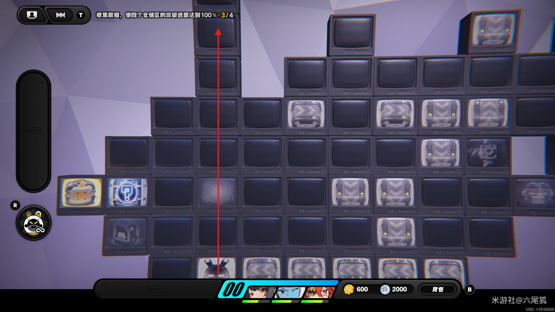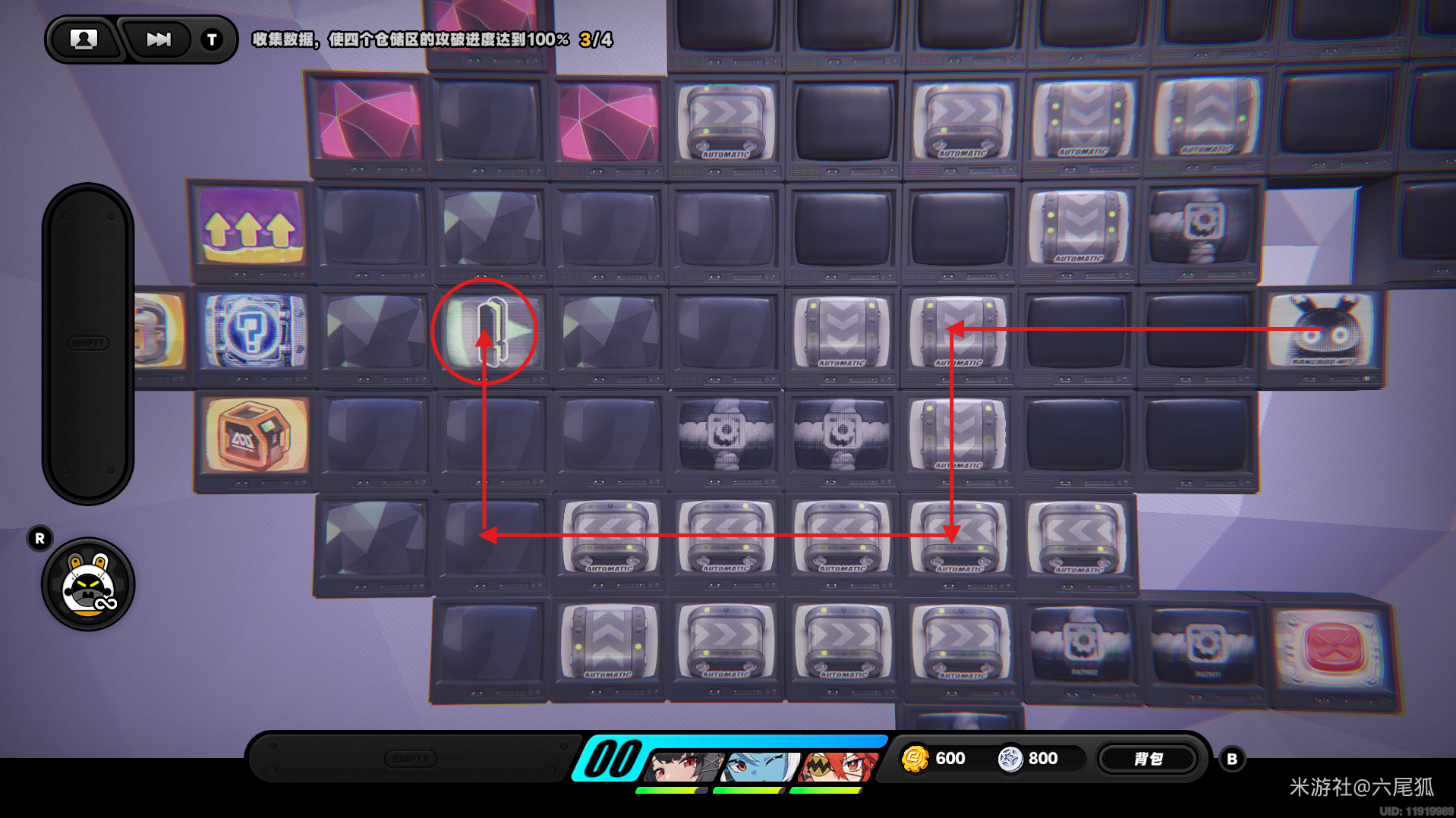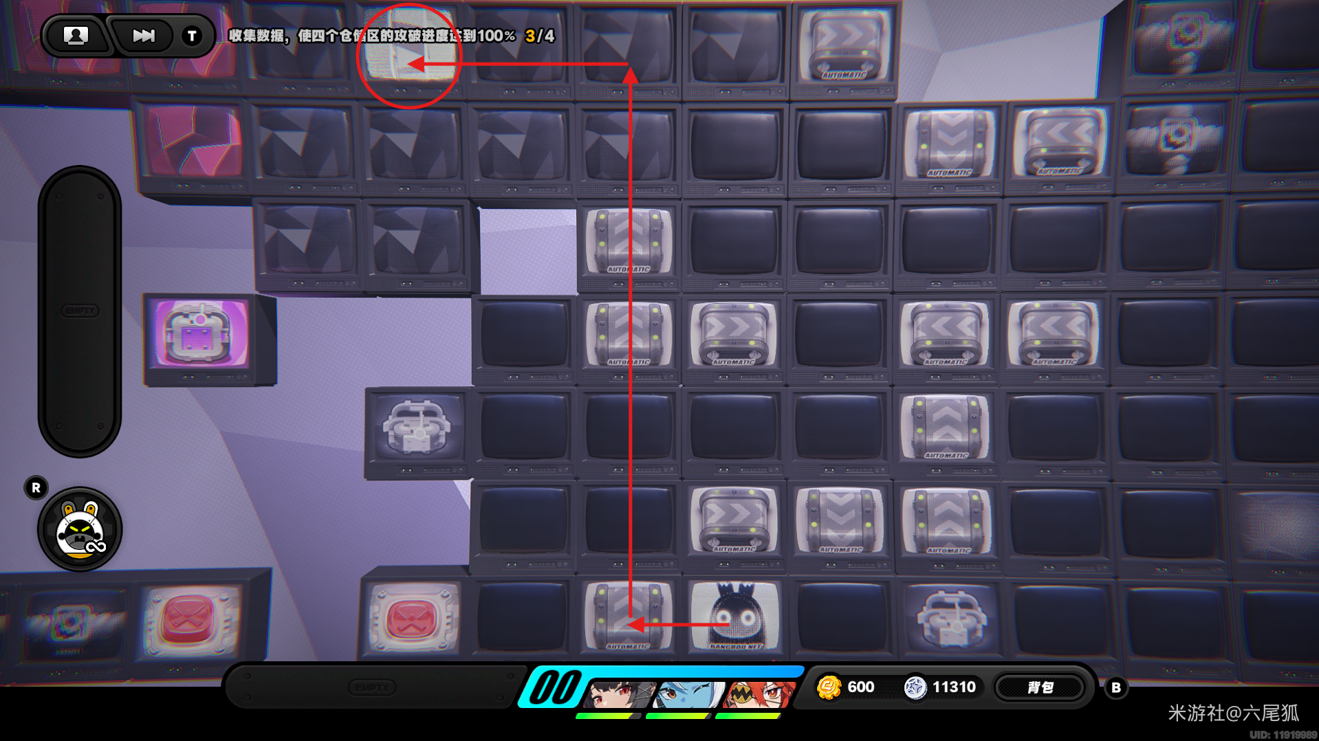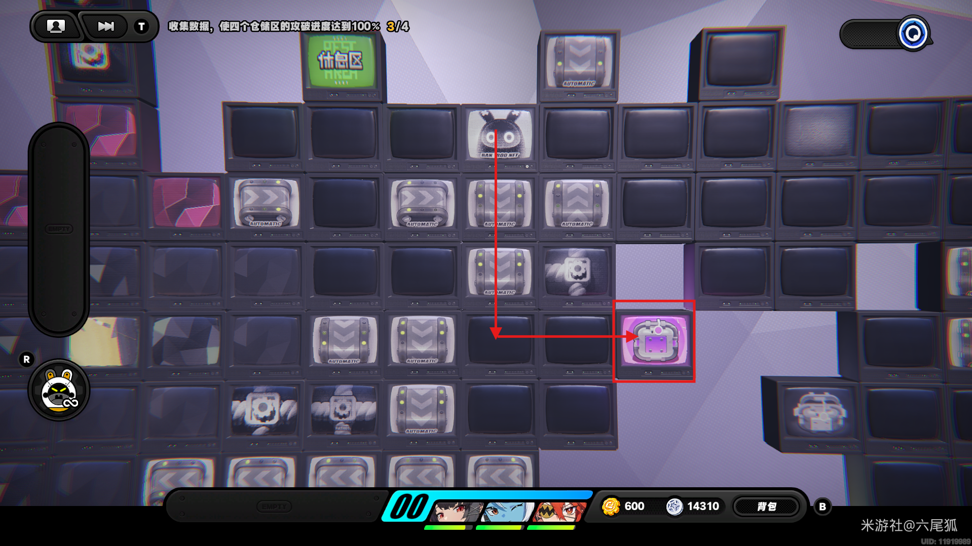 返回上方,在圆圈处使用增幅仪,这次的选择题答案是:2自恋邦布!(仓储区D进度100%,物资箱25/30,钥匙4/4,总物资箱进度106/130)
