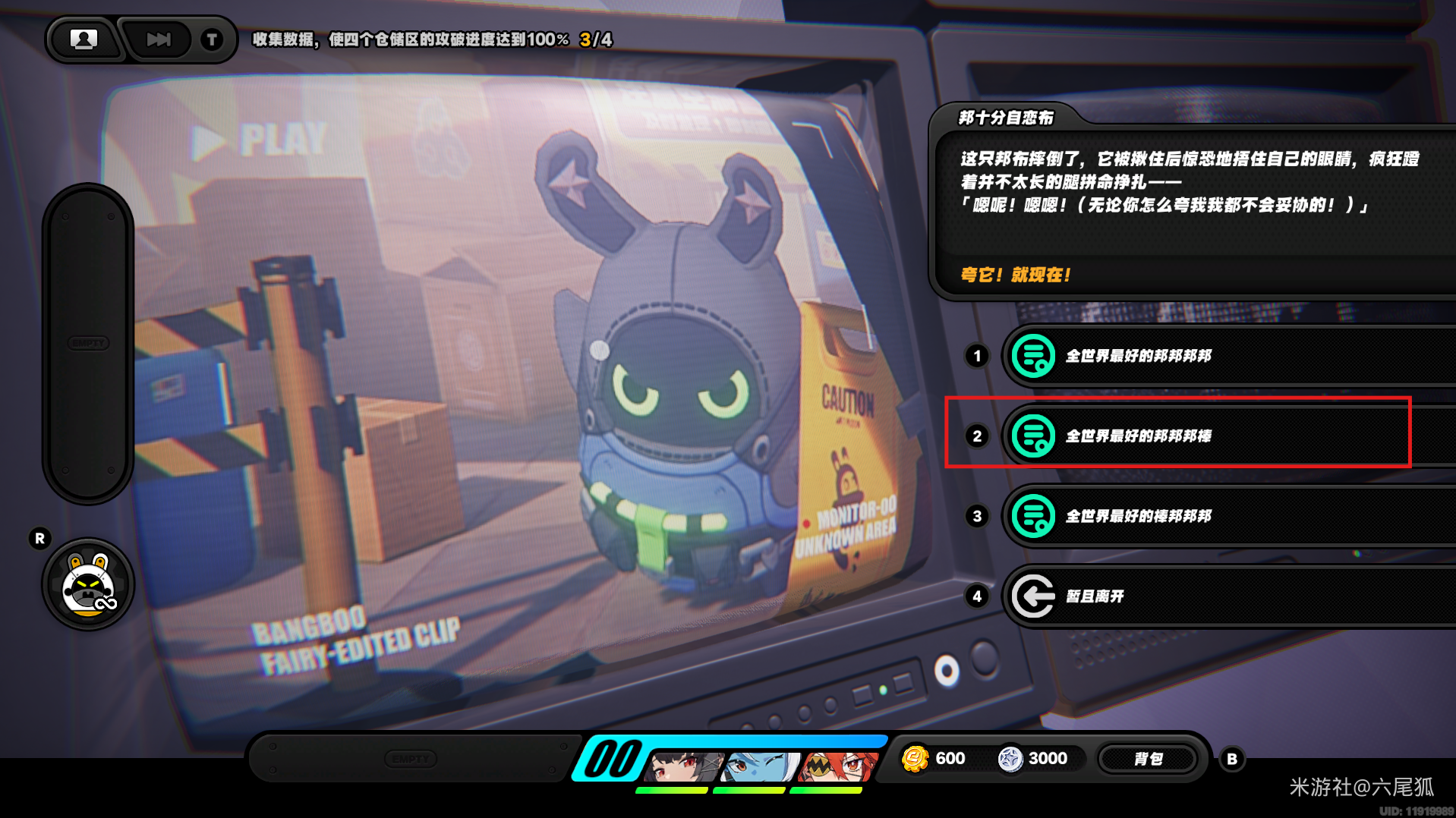 重要提示: 邦布的问题答错了没关系,不会影响任何奖励,最多就是角色掉点血而已,别太紧张!