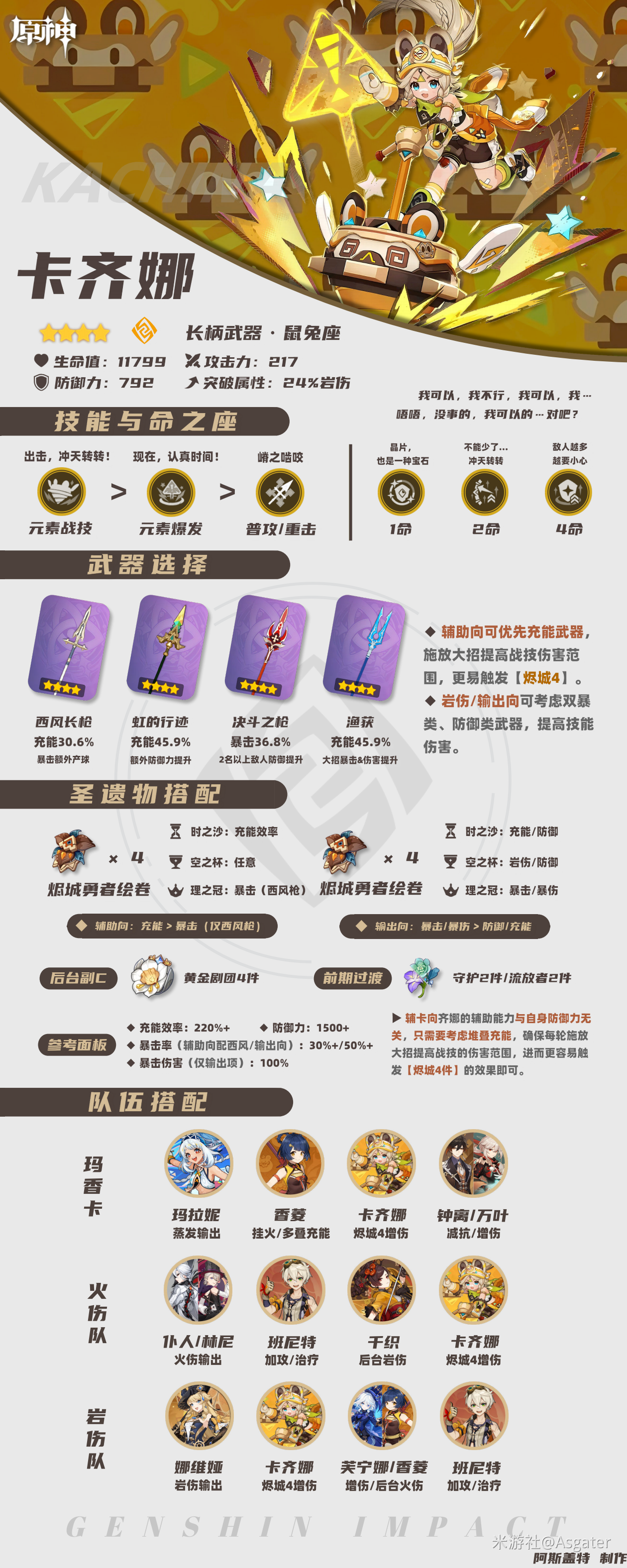 ① 强烈建议凑齐!卡齐娜小姐姐本身没有辅助能力,但她最大的优势就是能轻松触发【烬城4】的效果,给全队提供元素增伤,简直是行走的BUFF机!
