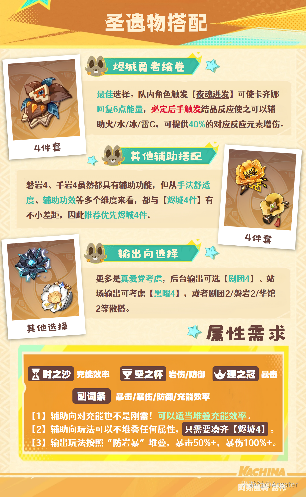 ② 辅助岩C。【烬城4】的效果是提高装备者触发反应的相关元素,也就是说可以提高岩元素增伤,卡齐娜搭配岩C能互相缓解充能压力,降低充能需求,简直是最佳拍档!
