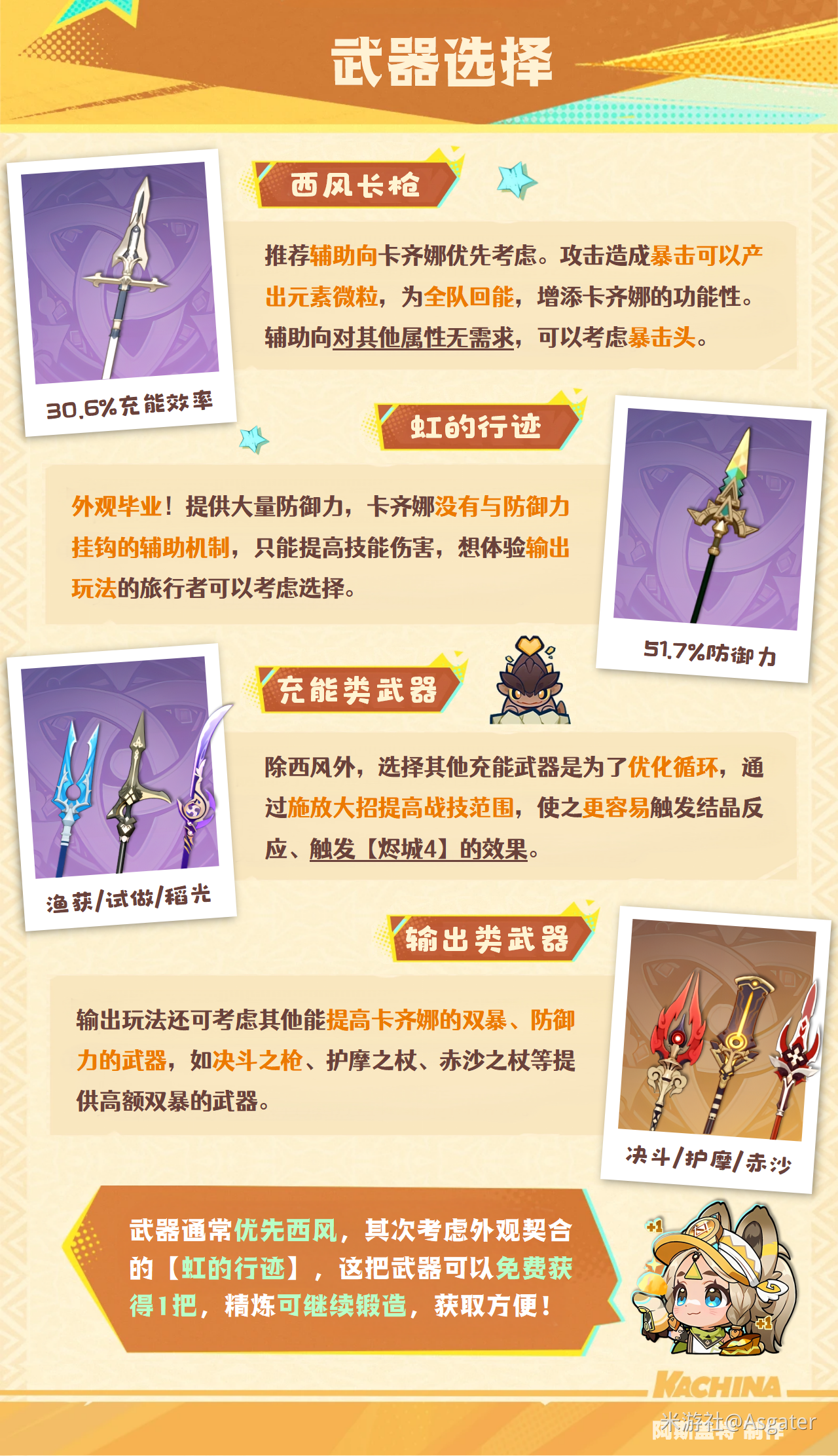 ① 卡齐娜的输出核心在于战技带来的岩伤,但问题来了,适合防御力倍率角色的长柄武器屈指可数,目前只有【虹的行迹】和【决斗之枪】可选。