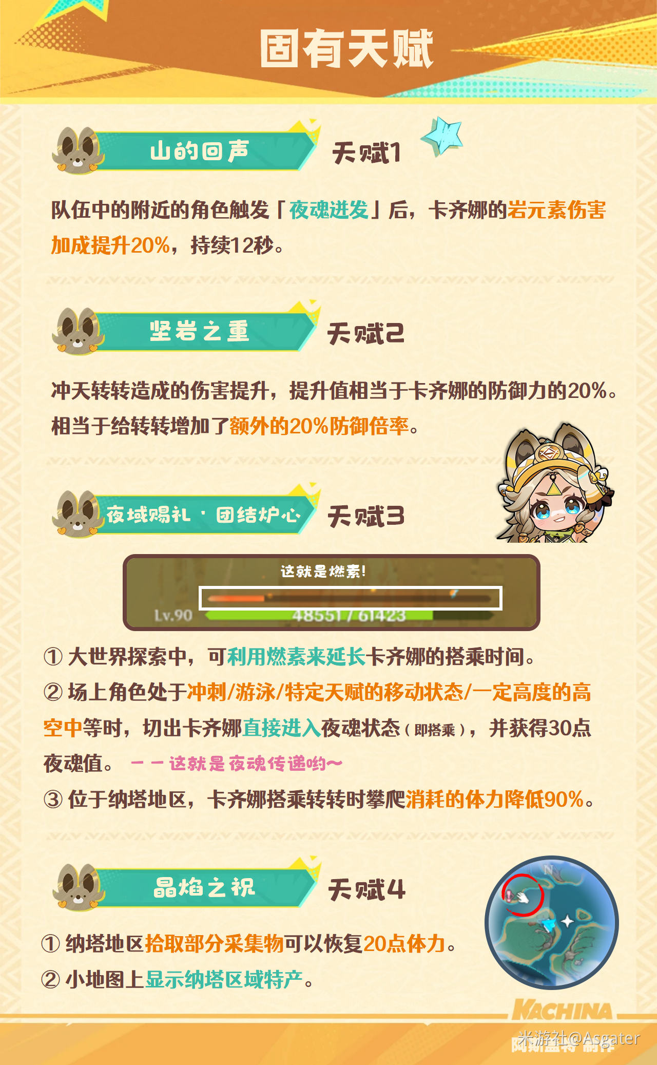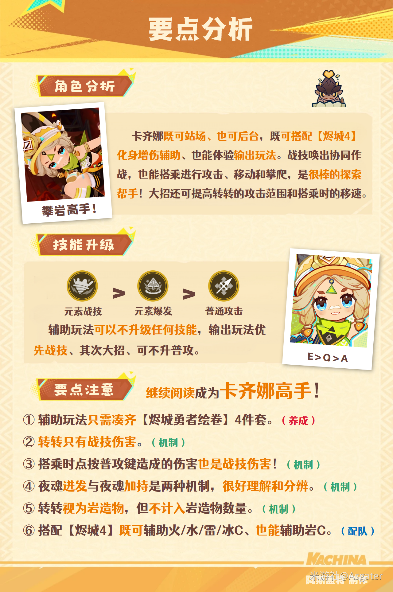 ◆ 卡齐娜没有岩伤普攻,普攻的使用频率不高;即使是站场玩法,也是利用战技搭乘转转,持续点按普攻,所以普攻天赋可以忽略!