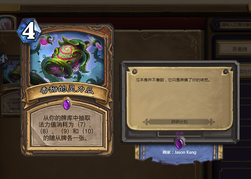 从牌组中抽出四张大哥随从,而如果我们手气好抽到艾维娜的话,可以在下回合直接使用两个大哥,而一旦我们的对手解不掉我们的艾维娜,我们可以在接下来的回合只花费一点费用随心所欲的召唤我们的大哥,而灵力瓜给我们抽了四张大哥也是为了这种情况而准备的。