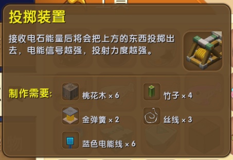 投掷装置可以用来投掷物品。投掷装置放在地上后,在上面可以放上需要投掷的物品。在投掷装置旁边放一个开关,这个装置需要电石能量来驱动。电能信号越强,投射力度越强。打开开关后,投掷装置会把上面的物品投掷出去。能投出40格远的距离,而且被砸中的生物会掉血。