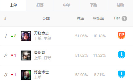 新版的刀妹从各个方面来看都是十分出色的存在,虽然在8.8版本遭到了小幅度的削弱,但是这丝毫不英雄她在上单位置上的出色地位,目前刀妹以51.06%的胜率和10.13%的登场率位列上单位置最为OP的位置。