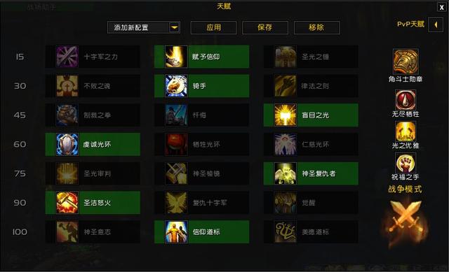 奶骑扛旗场VIP治疗,PVP天赋一定要出双祝福,可以为旗手提供两次的自由之手,对面中场拦旗子,你的双自由真的是神技,两次牺牲,搭配无尽牺牲100%转移伤害,让扛旗的队友站撸30秒的核心,这个天赋搭配要为盗贼烟雾弹之后摔坏的每个键盘负责。光之优雅,圣光术的治疗量提高50%且最多为治疗目标提供3层15%减伤的天赋,很强大、很重要。