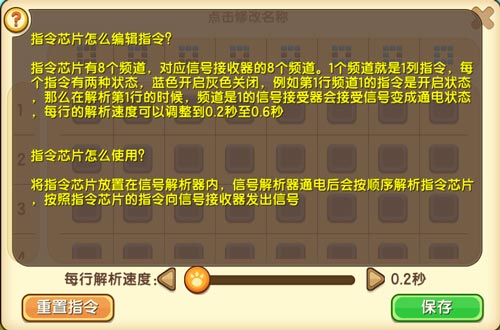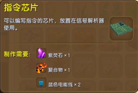 使用道具后,会进入指令编辑模式,编辑好指令后,将指令芯片放置在信号解析器内,信号解析器通电后会按顺序解析指令芯片,按照指令芯片的指令向信号接收器发出信号。制作指令芯片需要一个紫莹石,一个聚合物,2个蓝色电能线。