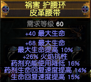腰带我选用的是长老底子的皮革腰带,核心词缀是药剂充能使用减少和生命回复速度提高
