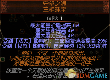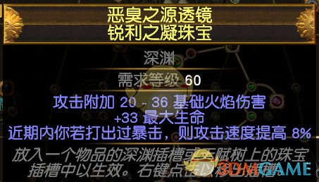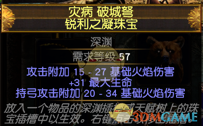 珠宝我身上的是生命+双火伤或者单火伤+暴击攻速,双火伤是之前带索伏的时候用剩下来的,也可以走混伤,珠宝好找,不过走混伤的话技能就不连火穿了,换成幻影射手或者投射物减速