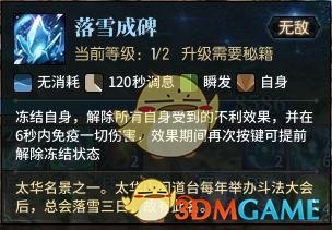 位移技能:瀚海冰:使附近6米内的目标无法移动,持续5s;2s内再次按键可施展招式寒云隐,使自己快速向后方回避。没错这个技能在我眼里就是位移技能。